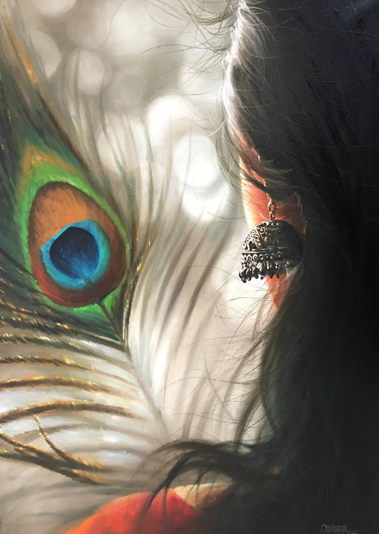 Oil painting by Rajasekharan. Realistic painting.Indian woman with peacock feather