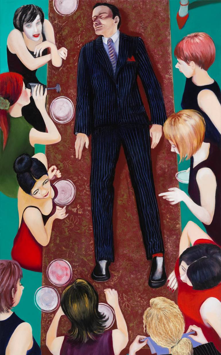 A colorful mixed crowd of ladies met for an extraordinary dinner. For today an attractive gentleman is to be eaten. Where will these ladies start?