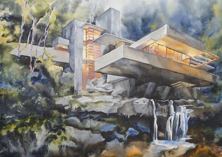 Fallingwater is a house designed by the architect Frank Lloyd Wright in 1935 in the Laurel Highlands of southwest Pennsylvania, about 70 miles (110 km) southeast of Pittsburgh in the United States.[4] It is built partly over a waterfall on Bear Run in the Mill Run section of Stewart Township, Pennsy...