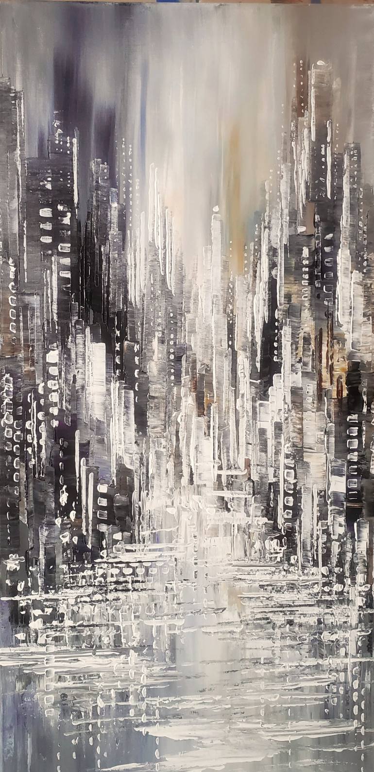 Skyscrapers, adorned with icicles, stand as silent sentinels against the cold. This is an original palette knife cityscape painting. Sides of the canvas are painted grey. You will receive it "ready to hang", with a wire attached on the back. Protective coat of satin varnish applied. The painting i...