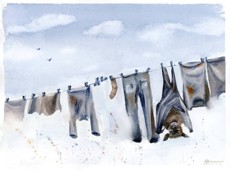 Funny drying on a rope. - Original Watercolor Painting