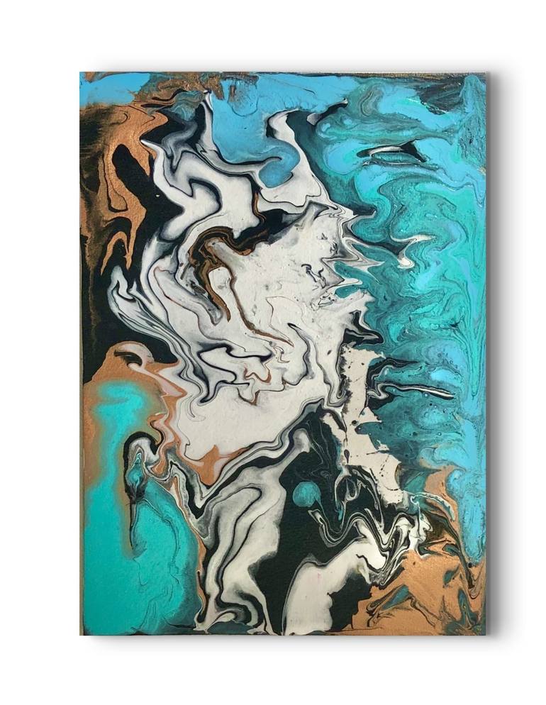 This acrylic original artwork presents a woman's face that has been smudged, disfigured and twisted, providing a dreamy impression. The main colours are turquoise, golden copper, black, and white, which combine effortlessly to produce a sense of mystery and intrigue. The woman's features are slightl...