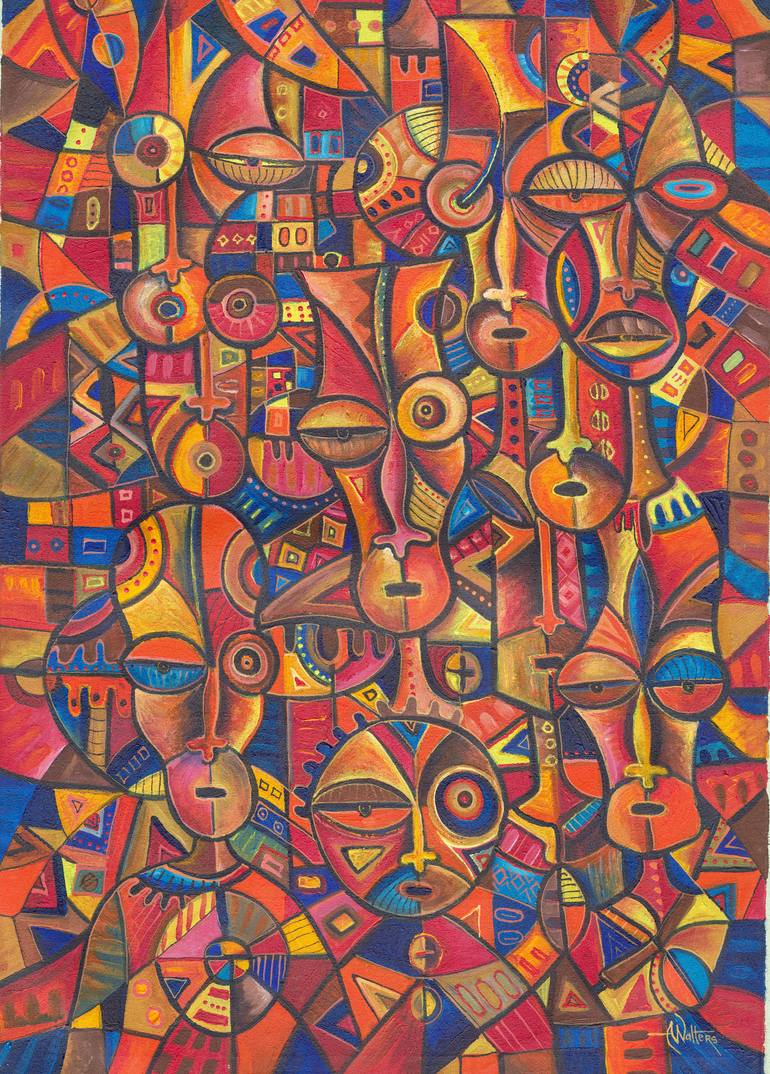 It's an abstract figurative painting of faces by Angu Walters in Cameroon, Central Africa.