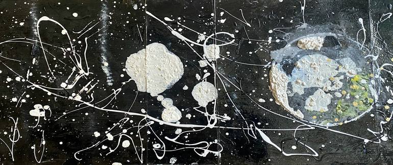 This piece is a combination of my black and white series and my black night sky series in that it uses egg shells as they black and white series does and explores space as the black night sky space series does.