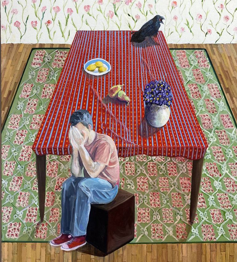 A pose taken directly from a Van Gogh drawing, "At Eternities Gate" and combined with Rodin's "The Thinker". The items on the table and patterns on the wall and floor hint at symbols of loss and love. Matisse's use of repetition and pattern also was an influence.