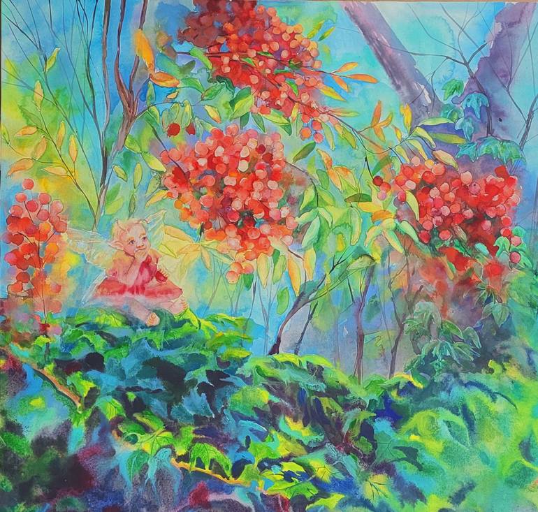 Painted with watercolour in an impressionistic style during my time in Australia in 2023, this colourful artwork depicts a scene in a magical wood inhabited by fairies. One of them features in the painting, delighting in a juicy berry freshly picked from a bush.