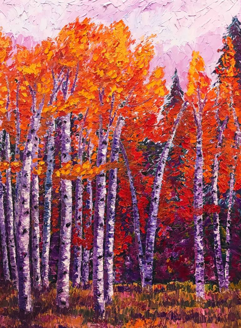 The original oil painting, 36”x48”, entitled Fall Aspens, was painted in the city of Portland, Oregon USA, in fall 2017. The painting depicts fall leaves, set ablaze in color at Black Butte Ranch near Sisters, Oregon as the sun sinks in the sky. The trees cast shades of blue and purple shadows on t...