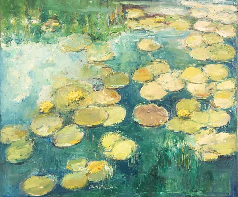 heavily textured oil on canvas, painted with brush and palette knife; light on water and yellow water lilies painted in impressionist style