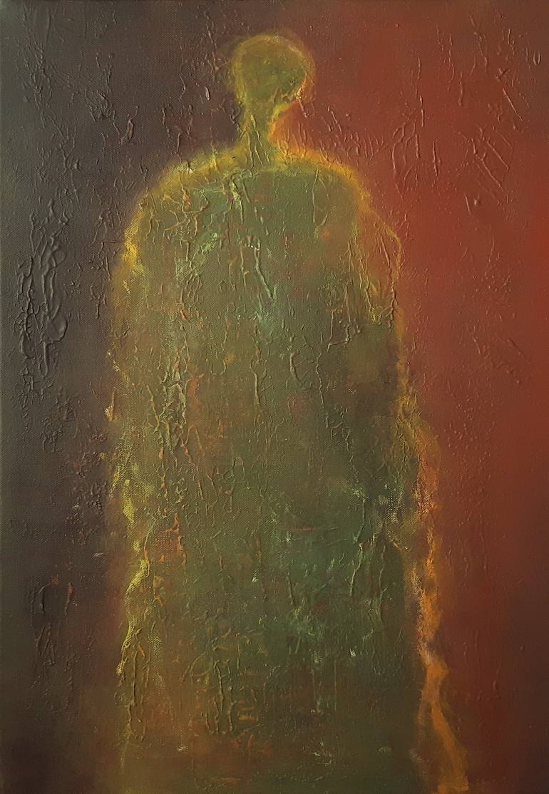 This unique, one-of-a-kind painting captures the essence of the human condition through a contemporary lens. The standing figure, a study in contrasts, evokes a sense of both mortality and resilience. The artist's hand is evident in every stroke, creating a textured canvas that invites closer inspec...