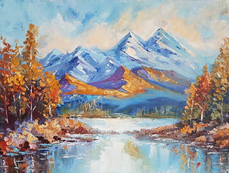 Oil, canvas board 12x16 inches, palette knife. My painting has a thick texture and strokes that can be seen. This gives the picture more vibrant colors. Immerse yourself in the breathtaking beauty of Colorado's autumn with this stunning palette knife oil painting. The scene captures the vibrant hu...