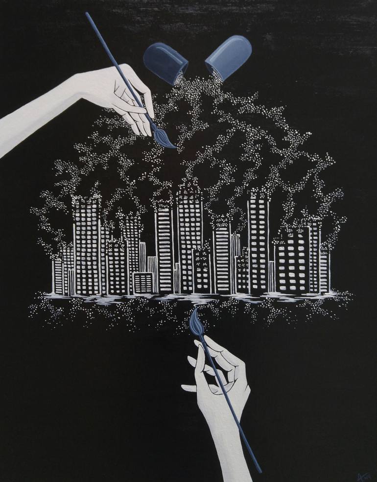 TITLE: Nightcap SIZE: 22″ x 28″ x 0.75" (56cm x 71cm x 2cm) MEDIUM: Acrylic on canvas CANVAS: Stretched, Canvas sides are painted black SIGNATURE: Initialed on the Front, Signed, dated, and titled on the back VARNISH : Gloss Finish