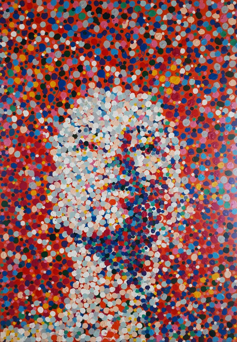 Acrylic on canvas. This work is only constructe with thousands of points. The perception is very abstract and becomes figurative as one moves away. The dots give an effect of movement, vibration and depth. The face has no definite limit, it is related to what surrounds it.