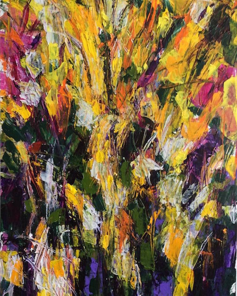 I live near the Bklyn Botanical gardens and love painting the beautiful colors and blooms of the flowers and trees. This is one in a series of bold colorful paintings on paper that explore the beauty of nature. The piece is 12x18.