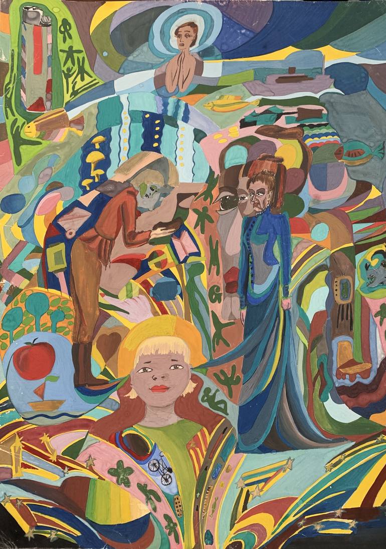 The work is constructed as a multilayered symbolic scene in which family roles and emotional states coexist across different temporal and psychological planes. The figures of the mother and children are not connected through linear narrative; instead, they unfold as fragments of inner experience, me...