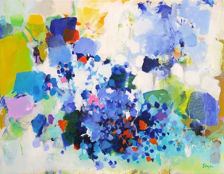 Here we have a painting that radiates joy and happiness and promises us hope. The finely graduated shades of blue that fade into green and yellow are sprinkled with a dash of red, pink and violet. The ingredients are perfect and ensure a peaceful coexistence. If there was too much tension, it would ...