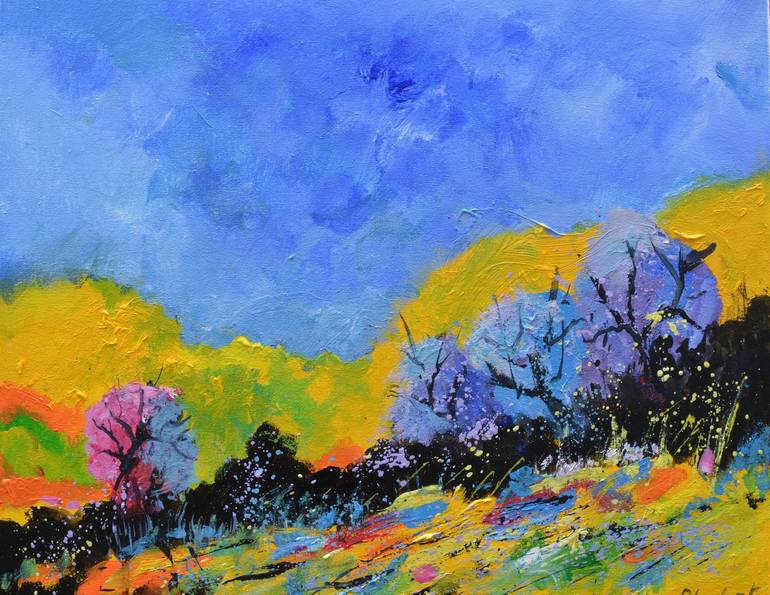 This artwork features a vibrant and dynamic landscape characterized by a bold use of color and texture. The sky is dominated by shades of deep blue, contrasting beautifully with the hills in gradations of bright yellow and burning orange. Pastel-colored trees, purple and pink, dot the middle of the ...