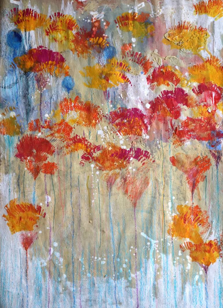 "Fantasy with Flowers" (100+ paintings) paper 59x42cm On the paper acrylic, oil pastel, felt-tip pen, ink, gold leaf, pencils, silver,mixed media. Flowers are a smile of the sun that gives joy. When you think of flowers, in your imagination, as in a fun round dance, roses and carnations, poppies ...