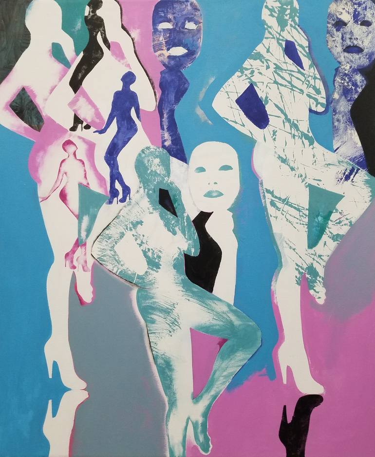 Poses of female models found in fashion magazine made to look like cut-outs are repeated as negative and positive space. Minimal use of colors are bold and flat and enhance the graphic nature of this painting. Very striking, the style is inspired by Pop Art.
