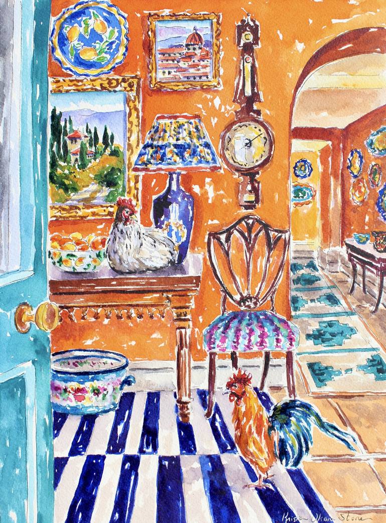 "Feathers And Frescoes", is a 12" x 9" or 30.48cm x 22.86cm original watercolor and ink painting of a lovely interior in a Tuscan home. The warm walls and arched ceilings reminded me of the warmth of a 12th century Tuscan farmhouse where I taught my first international painting workshop many years a...