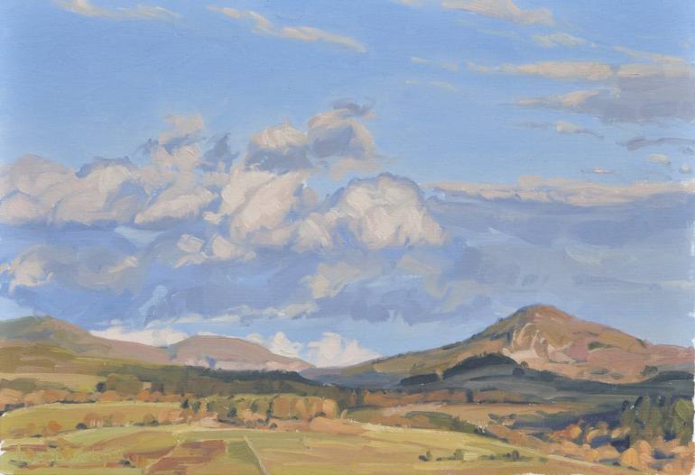 Landscape of Auvergne, France. View from my studio. The composition is dominated by a vast expanse of sky, where ample and vaporous clouds stretch and blend. These clouds, treated with a subtle palette of bluish grays and pearly whites, create a sensation of lightness and movement. The earth below i...