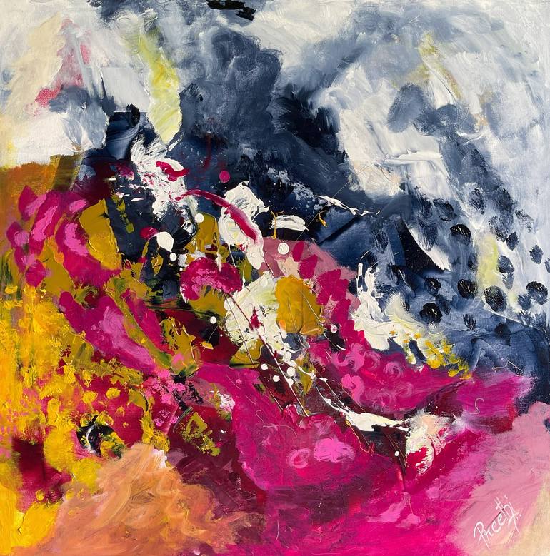 This one-of-a-kind 24x24" painting is handmade composed of unique shades of pink, gray, and yellow to create a balanced and harmonious palette. This original painting evokes warm emotion and cheerful vibes. 24x24 canvas size is perfect for any room to add a unique touch to any home décor. MEDIUM: ...