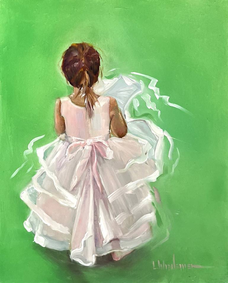 This is part of series of paintings I'm working on featuring children on simple one color backgrounds. This small child was so thrilled to try on such a beautiful dress that she just vibrated with excitement.