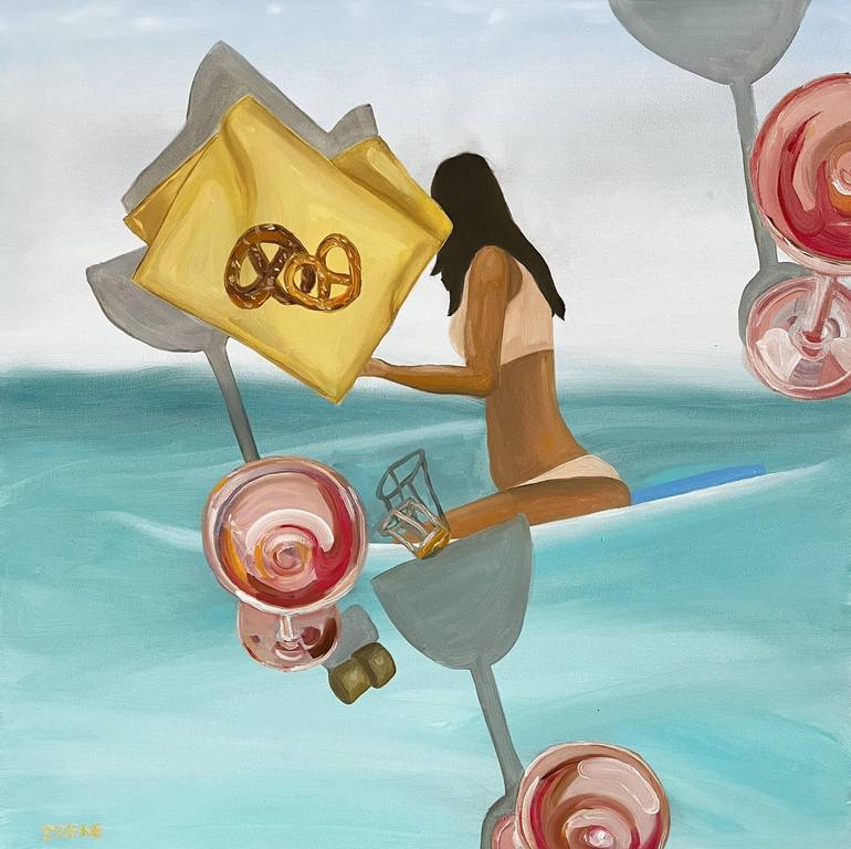 The painting transmits the summer vibes of rose, cork from a recently opened bottle on the beach, and the smell of the sea and salt.