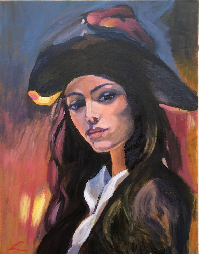 A painting depicts a woman wearing a large black hat, with her face partially cast in shadow, exuding a mysterious aura. Long hair flows down her back, suggesting a sense of movement and elegance. The background of the artwork features three distinct color blocks of bright orange, light pink, and li...