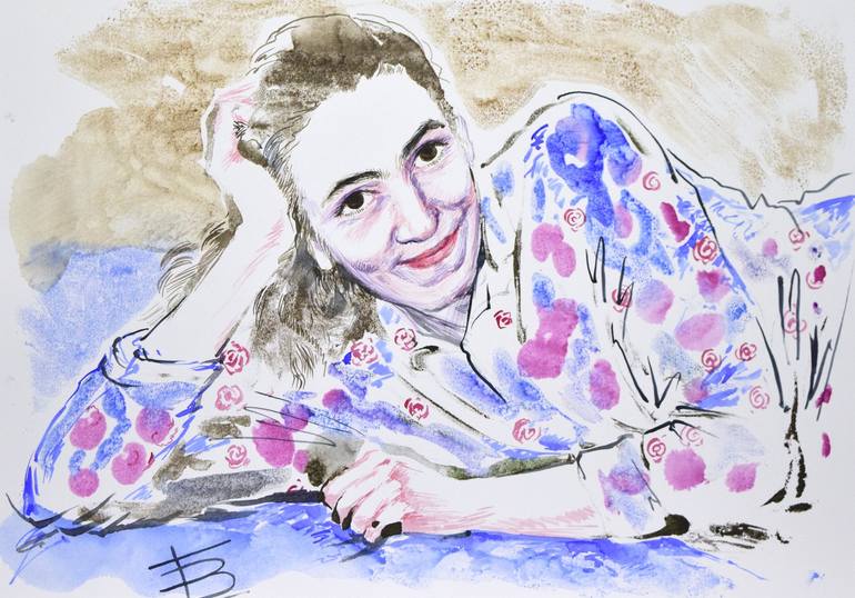 The portrait was executed in the technique of mono print from the photo with the use of subsequent detailing with brush strokes. Here I used A-3 format paper, watercolors and paints for painting silk.