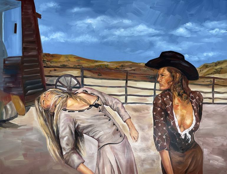 A frame from the movie “Les Pétroleuses”. A dynamic moment reflecting the character of the heroines and a showdown in the spirit of the Wild West.