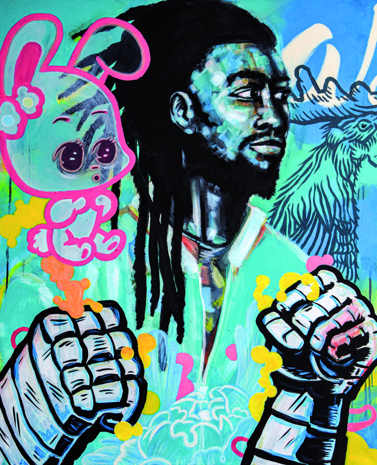 is it a fight? the man is looking peaceful and the superhero fists are not his. so who is fighting – and why? no one really wants to fight but circumstances can lead to fights, to the loss of innocence. do we have a choice between fighting or not?