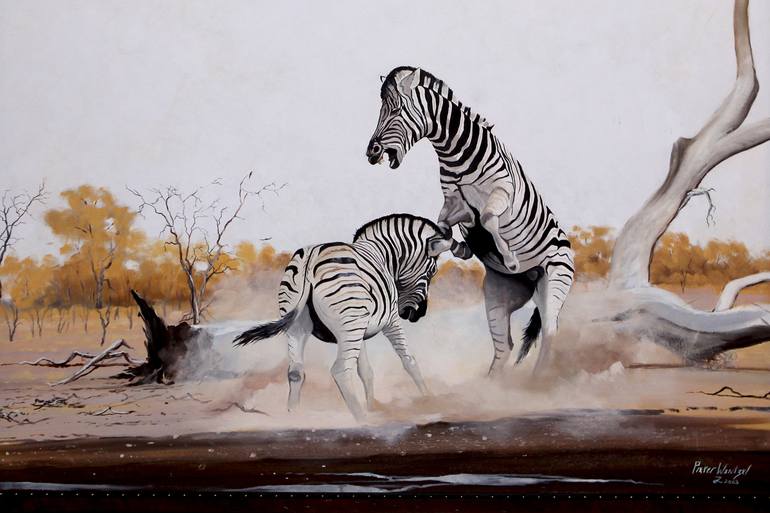 I like to paint scenes of zebra fighting as there is a very special reason for this.The main stallion is being challenged to prove his strength against the dominate stallion-should he be prove to be worthy to take the dominate stallion s daughter as his prize,to start his own kingdom.