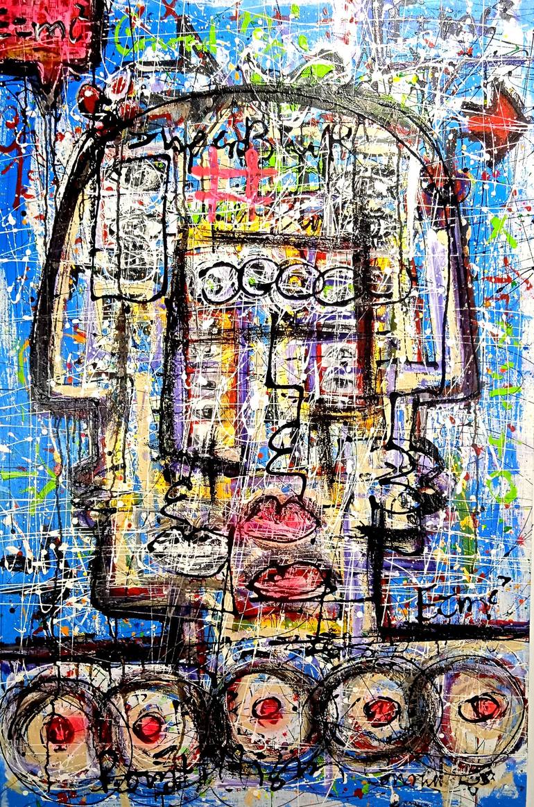 This painting depicts abstract figuration and may contain the equations of the General Theory of Relativity, the equation of the Second Law of Thermodynamics dS≥0. The facial features are exaggerated with legions of eyes, double mouths etc. The texture is achieved with a mixture of Acrylic, Enamel a...