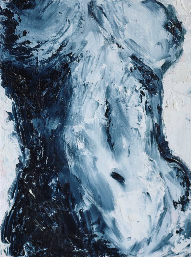 Minimalistic oil painting of a woman's body painted using only two colors white and blue
