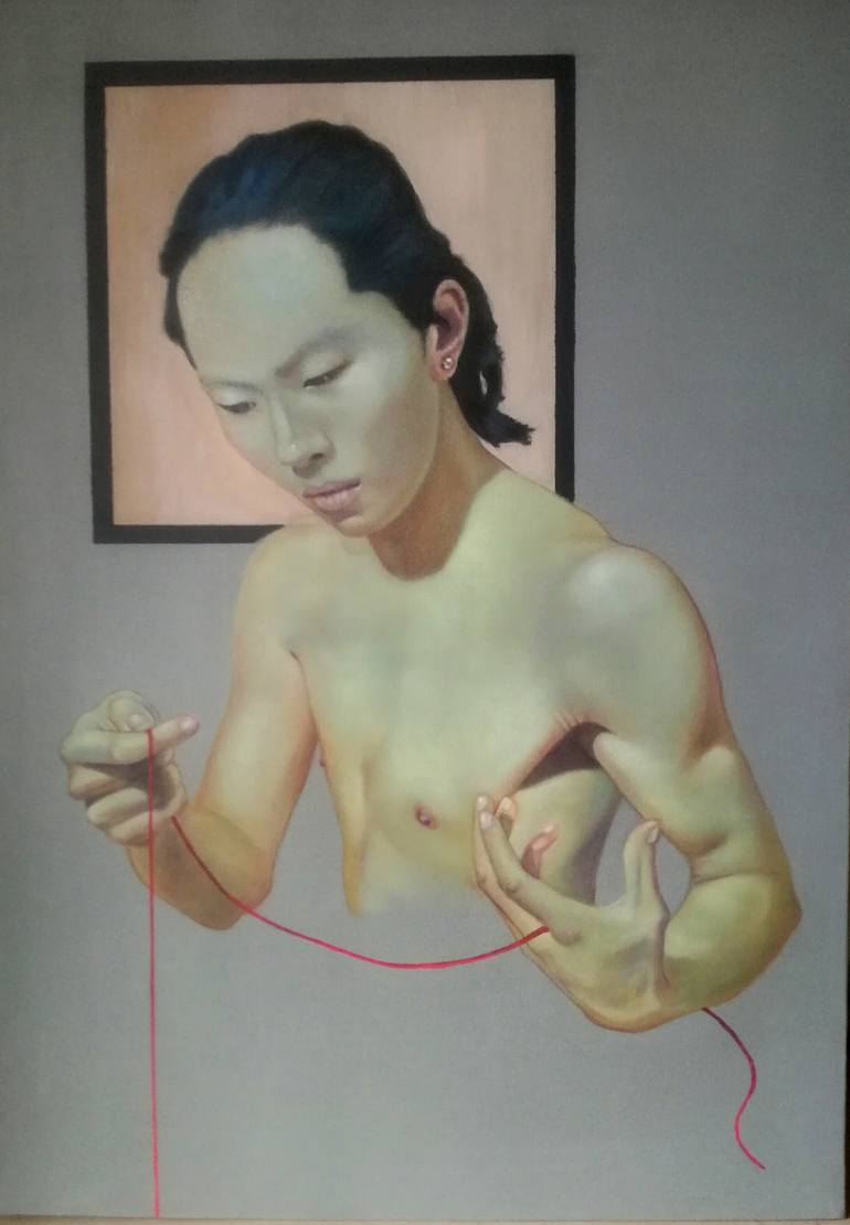 Rappresenta un giovane orientale che sospeso regge in mano un simbolico filo rosso che pesca nel vuoto