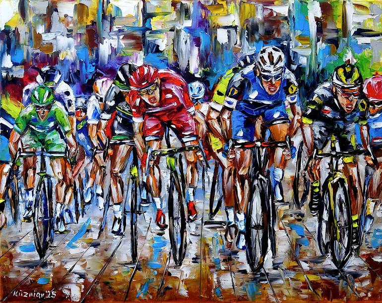 An intense Tor de France cycling race, with several cyclists battling for victory in a thrilling sprint. The scene is depicted in an expressive, dynamic style with bold palette knife strokes and bright colors. Their faces show effort and determination as they lean on their bikes and pedal with full...