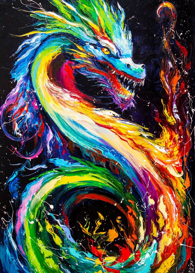 Liubov Kuptsova unveils the mythical grandeur of the fire dragon in this figurative spectacle. Each knife stroke on the canvas translates into a vibrant scale and smouldering hue, igniting the imagination with visions of this incredible creature. The fiery palette and bold textures bring the legenda...