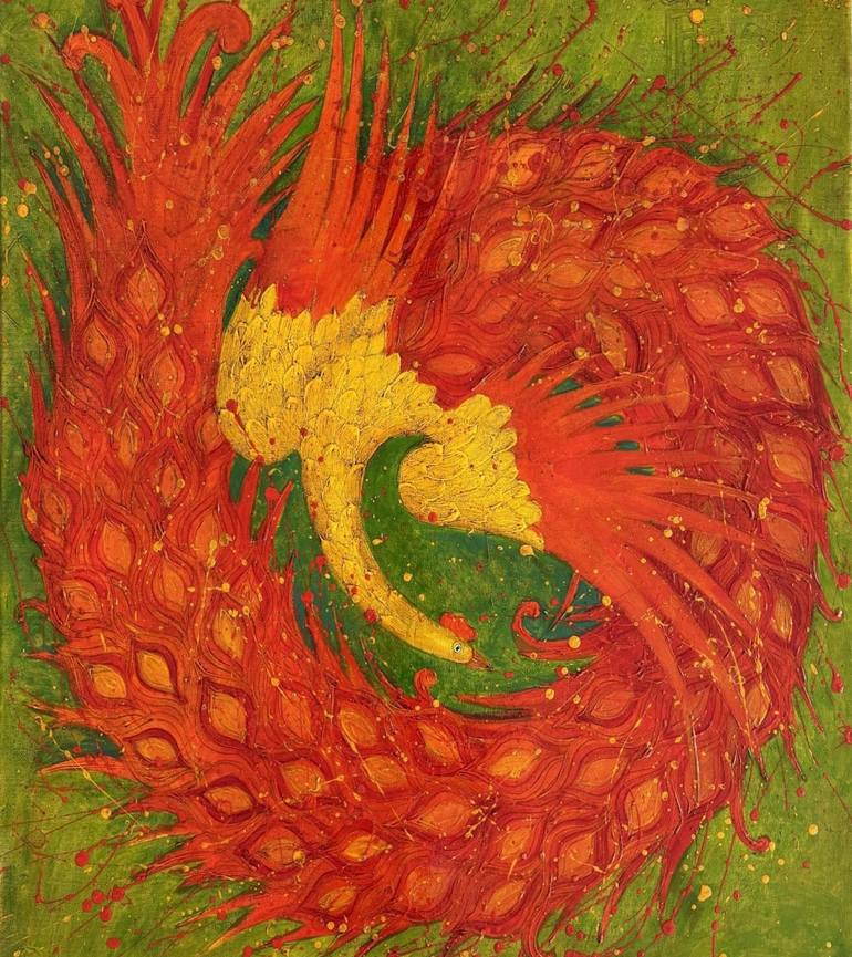 This stunning original piece titled "Firebird" was created by contemporary Russian artist Vyacheslav Gayun in 2024 and is available for purchase online. The painting features a powerful and majestic phoenix enveloped in a swirling blaze. Its body is adorned with vibrant orange and red feathers that...