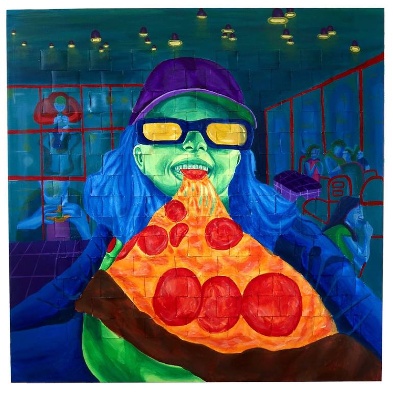 Painted on a weaved canvas, First day of Diet displays a restaurant scenery of a person eagerly taking a first bite of a "forbidden" pizza.