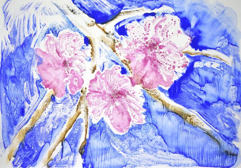 The first flowers on the apple tree. Together with the branches, the newly opened pink flowers are rapidly rushing up to the blue sky … The size is 84 cm X 60 cm. Technique monotype. Paper. Tempera, acrylic.