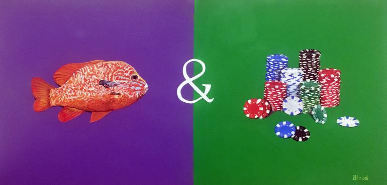 This is the second in a series of paintings featuring visual puns on words that are common expressions. Traditionally, the term "Fish & Chips" refers to a British meal. Here, however, it takes on a whole new meaning with a brightly colored fish next to a stack of poker chips with an ampersand in the...