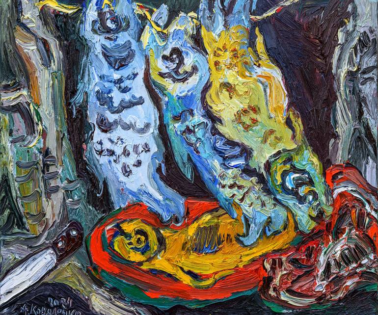 "Fish", 23.6x20 inches (60x50 cm), oil on canvas, 2024. This painting is painted thickly, in oil colors, in a bold and expressive manner. It is created for those who love and appreciate professional painting and need something unique. This still life is painted by the famous Ukrainian artist Andrey...