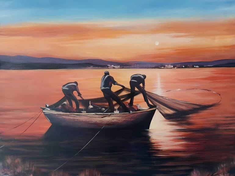 Oil painting on canvas showing three fishermen on the fishing boat. Technique used The painting was created with a mixed palette of fine quality oil paint. The artist used the brush technique and he managed to achieve great level of detail on the piece. The painting is stretched on a natural canvas...