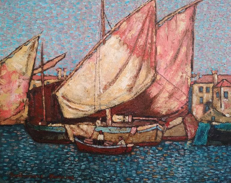 "Fishing Boats in the Harbor" Impressionist painting The painting is signed under the pseudonym "Baltassare Mancini". I used this pseudonym to sign my paintings for several years. Oil on canvas 50x40cm