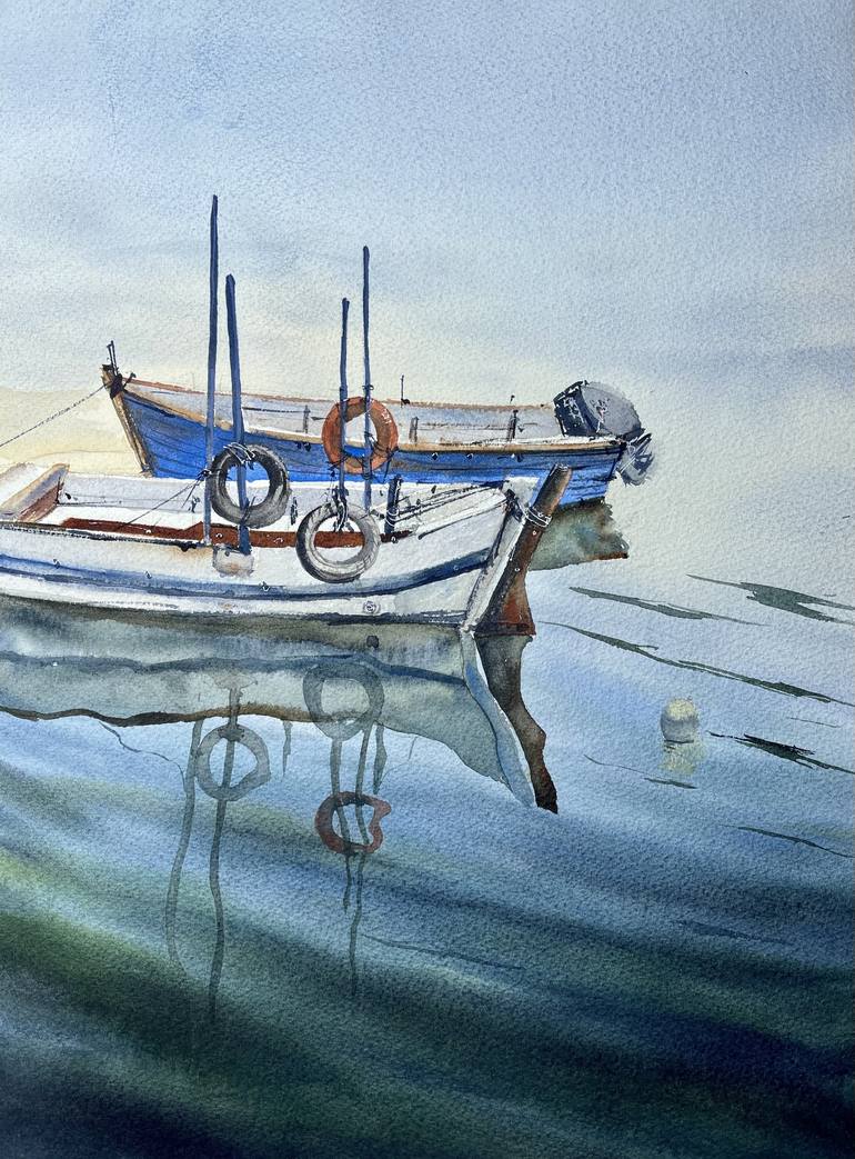 The silence, the water, the light rocking of boats on the water on a beautiful summer morning when many are still asleep. The waves are emerald-colored and reflect the boats and the clear sky.
