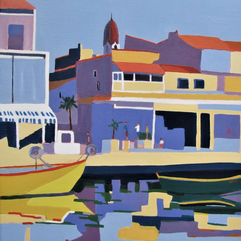 This original oil painting captures a view of the charming harbor of Palavas les Flots in the south of France. The artist beautifully depicts the scene with the church bell tower in the distance and fishing boats moored along the quay in the foreground. The composition features a yellow boat, a whar...