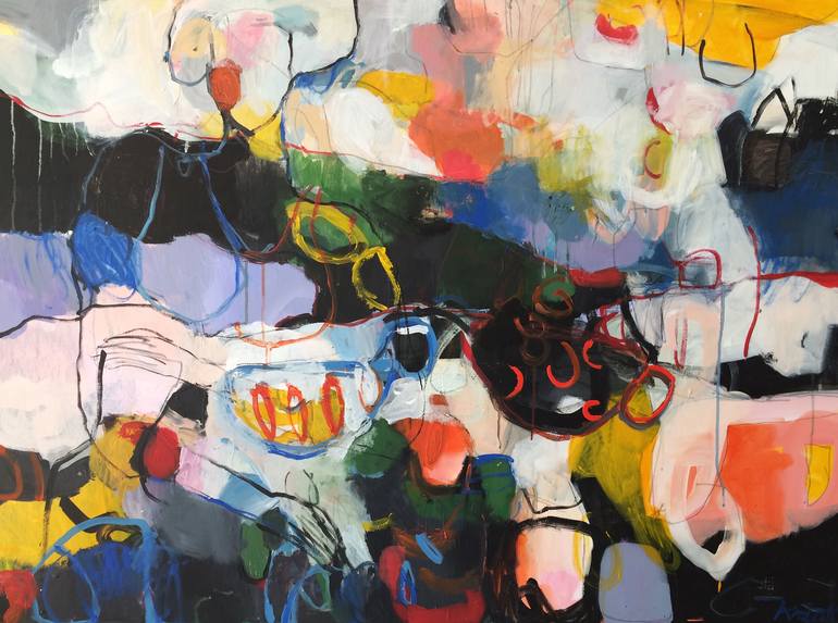 Original, colorful acrylic and pencil on canvas. Sides are painted and varnish applied.
