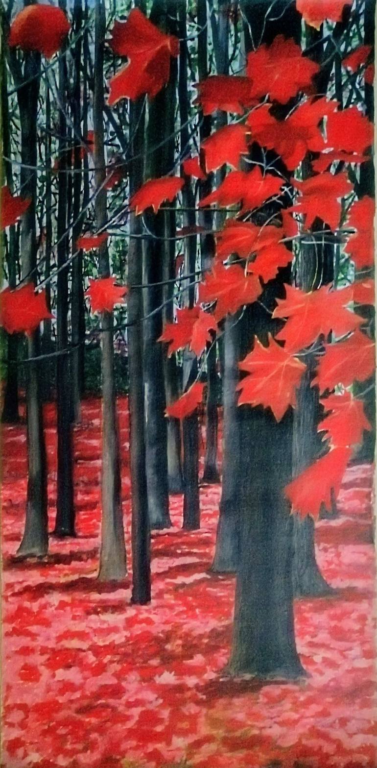 Flame of the Forest is an acrylic painting on unstretched canvas. I painted this landscape in a vertical, portrait style. Fascinated by the fall colours of leaves and always wanted to paint the maple leaves, I conceptualised this forest painting, dominated by the rich red colour of the leaves. Fall ...
