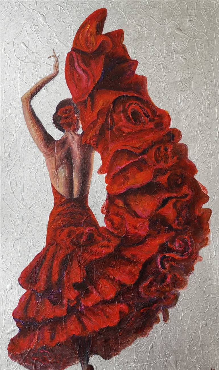 A flamenco dancer soars in dance... I work with silver backgrounds. Therefore, this painting changes depending on the lighting. It is always different. In addition, the painting has a structure.