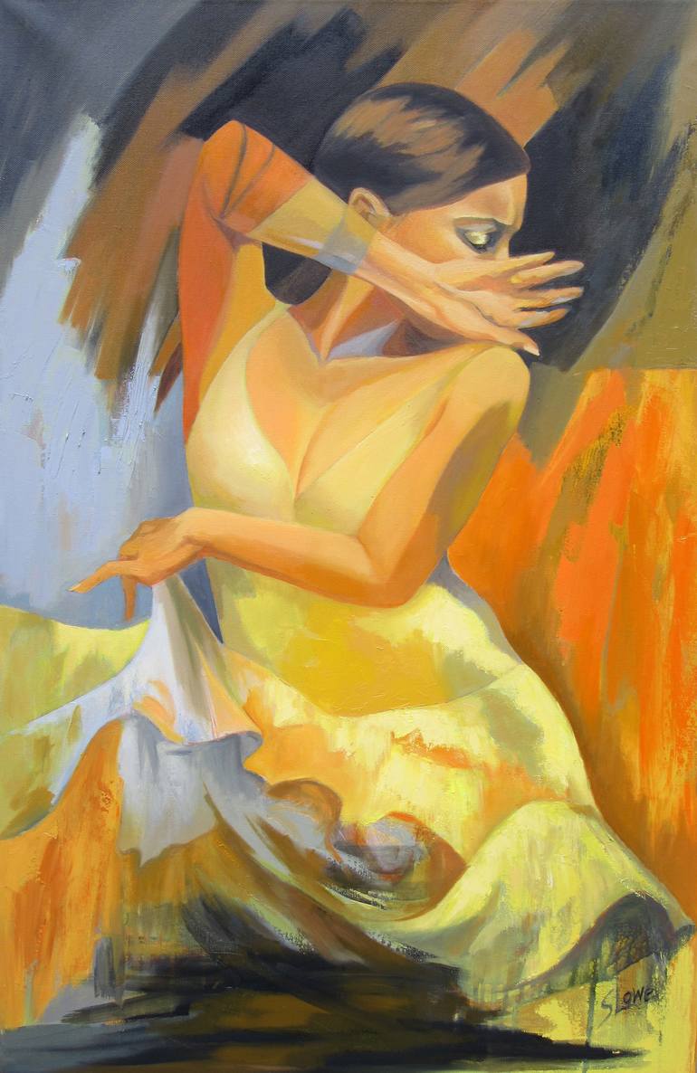 Flamenco dancer in action pose holding her hand in front of her face in tones of yellow, orange, gray and black. In this series of paintings, I’m inspired by Master Artists such as Matisse and Diebenkorn and Abstract Expressionists, such as DeKooning and Mitchell and contemporary “Street Art”. I lov...